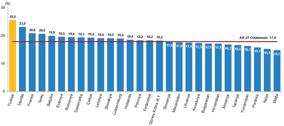 Avrupa Birliği (AB) üyesi 27 ülkenin çocuk nüfus oranları incelendiğinde, 2024 yılında çocuk nüfus oranının AB ortalaması %17,8 oldu. AB üye ülkeleri içinde en fazla çocuk nüfus oranına sahip olan ülkelerin sırasıyla, %23,0 ile İrlanda, %20,8 ile Fransa, %20,6 ile İsveç olduğu görüldü. Çocuk nüfus oranının en düşük olduğu ülkeler ise sırasıyla, %14,7 ile Malta, %15,1 ile İtalya, %15,7 ile Portekiz oldu. Türkiye’nin çocuk nüfus oranının %25,5 ile AB üye ülkelerinden daha yüksek olduğu görüldü.
