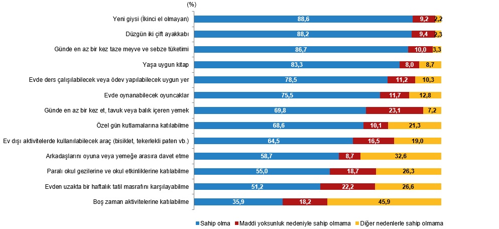 Gelir ve Ömür Şartları Araştırması, Çocuk Sıhhati ve Yoksunluğu Modülü sonuçlarına nazaran 2024 yılında, 15 yaş ve altı tüm çocukların yeni giysilere sahip olduğu hanehalkı oranı %88,6 iken maddi yetersizlik nedeniyle çocukları yeni giysilere sahip olamayan hanehalkı oranı %9,2, başka nedenlerle çocukları yeni giysilere sahip olamayan hanehalkı oranı ise %2,2 oldu.