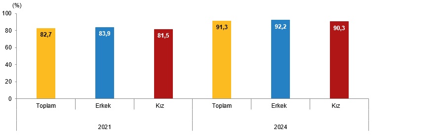 Çocuklarda Bilişim Teknolojileri Kullanım Araştırması sonuçlarına nazaran İnternet kullanım oranı, 6-15 yaş kümesindeki çocuklar için 2021 yılında %82,7 iken 2024 yılında %91,3 oldu. İnternet kullanımı cinsiyete nazaran incelendiğinde, erkek çocukların İnternet kullanım oranı 2021 yılında %83,9 iken 2024 yılında %92,2, kız çocukların İnternet kullanım oranı ise 2021 yılında %81,5 iken 2024 yılında %90,3 olduğu görüldü.