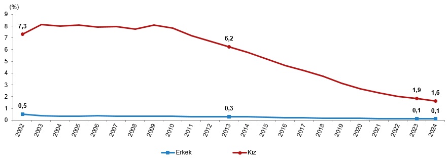 Cinsiyete nazaran çocuk evlenmelerinin toplam evlenmeler içindeki oranı, 2002-2024