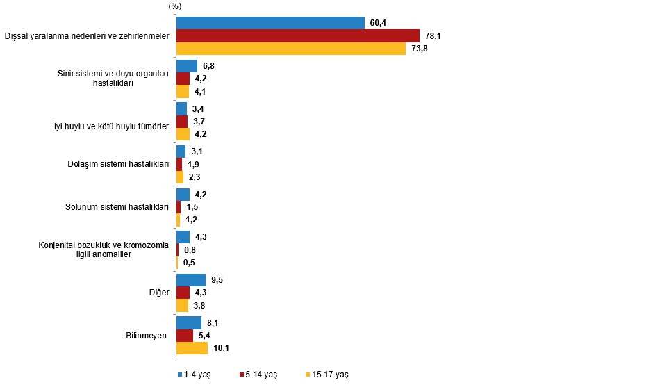 Ölüm ve Vefat Nedeni İstatistiklerine nazaran 2023 yılında 1-17 yaş kümesinde çocuk vefatları en fazla, dışsal yaralanma ve zehirlenmeler nedeniyle gerçekleşti. Kelam konusu nedenle hayatını kaybeden 1-17 yaş kümesindeki çocuk sayısı, 2023 yılında 13 bin 43 oldu. Hudut sistemi ve duyu organları hastalıkları nedeniyle 866 çocuk, yeterli huylu ve berbat huylu tümörler nedeniyle 671 çocuk, sirkülasyon sistemi hastalıkları nedeniyle 403 çocuk hayatını kaybetti.