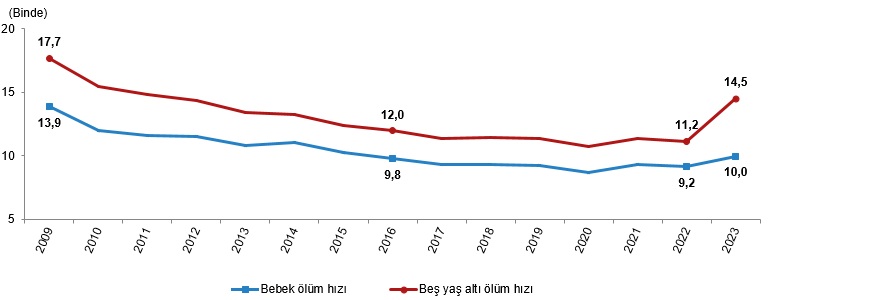 Ölüm ve Mevt Nedeni İstatistiklerine nazaran 2009 yılında bebek vefat suratı binde 13,9 iken 2023 yılında binde 10,0 oldu. Doğumdan sonraki beş yıl içinde ölme mümkünlüğünü tabir eden beş yaş altı mevt suratı, 2009 yılında binde 17,7 iken 2023 yılında binde 14,5 oldu.