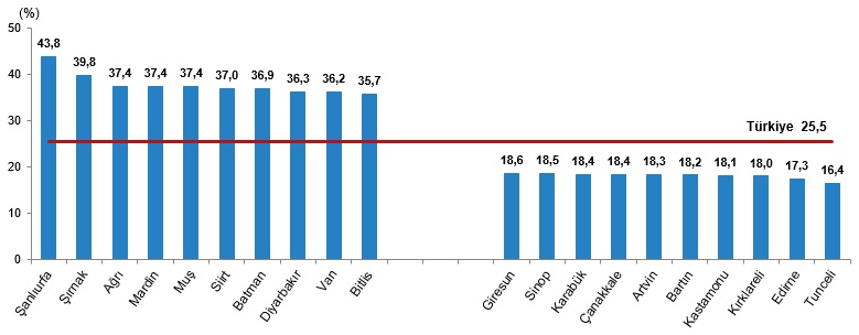 Çocuk nüfus oranının en düşük olduğu vilayet, %16,4 ile Tunceli oldu. Tunceli vilayetini %17,3 ile Edirne ve %18,0 ile Kırklareli izledi.