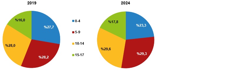 Çocuk nüfus yaş kümesine nazaran incelendiğinde, 2019 yılında çocuk nüfusun %27,7’sinin 0-4 yaş kümesinde, %28,2’sinin 5-9 yaş kümesinde, %28,0’ının 10-14 yaş kümesinde ve %16,0’ının 15-17 yaş kümesinde yer aldığı görülürken, 2024 yılında %23,3’ünün 0-4 yaş kümesinde, %29,3’ünün 5-9 yaş kümesinde, %29,6’sının 10-14 yaş kümesinde ve %17,8’inin 15-17 yaş kümesinde yer aldığı görüldü.