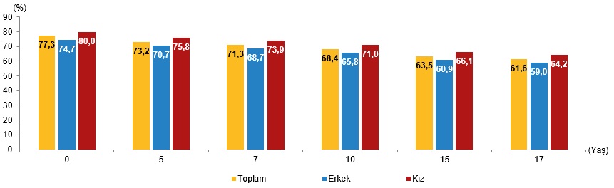 Türkiye’de 7 yaşına ulaşan bir çocuğun kalan hayat mühletinin ortalama 71,3 yıl, erkek çocuklar için 68,7 yıl ve kız çocuklar için 73,9 yıl olduğu görüldü. Çalışma çağının başlangıcı olan 15 yaşındaki çocuklar için bu müddet 63,5 yıl oldu. Erkek çocuklar için bu müddet 60,9 yıl iken kız çocuklar için 66,1 yıl oldu. Bu yaş için kız ve erkek çocuklar ortasındaki beklenen hayat mühleti farkının 5,2 yıl olduğu görüldü.