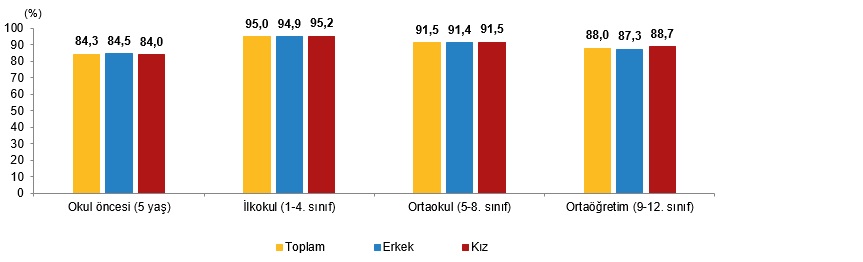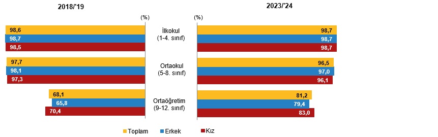 Ortaöğretim okul tamamlama oranı cinsiyete nazaran incelendiğinde, 2023/’24 eğitim ve öğretim devrinde bu oranın erkek çocuklar için %79,4, kız çocuklar için %83,0 olduğu görüldü.