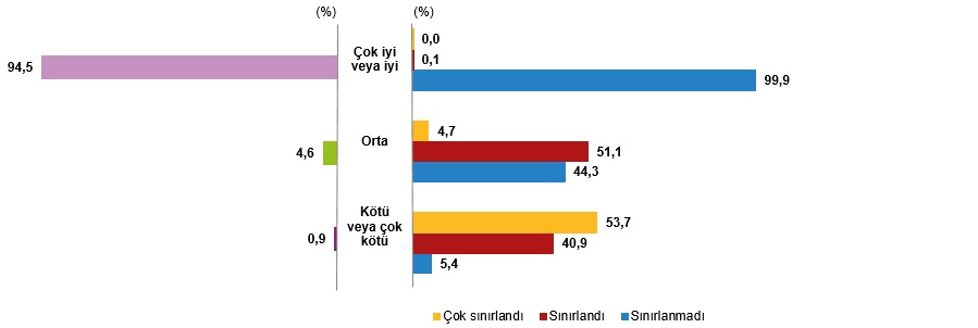 Gelir ve Hayat Şartları Araştırması, Çocuk Sıhhati ve Yoksunluğu Modülü sonuçlarına nazaran 2024 yılında hanelerde yaşayan 15 yaş ve altı çocukların genel sıhhat durumları incelendiğinde %94,5’inin “çok güzel yahut iyi”, %4,6’sının “orta”, %0,9’unun ise “kötü yahut çok kötü” olduğu görüldü.