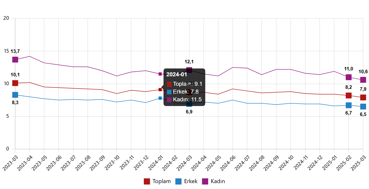Hanehalkı İşgücü Araştırması sonuçlarına nazaran; 15 ve daha üst yaştaki şahıslarda işsiz sayısı 2025 yılı Mart ayında bir evvelki aya nazaran 65 bin kişi azalarak 2 milyon 807 bin kişi oldu. İşsizlik oranı ise 0,3 puan azalarak %7,9 düzeyinde gerçekleşti. İşsizlik oranı erkeklerde %6,5 iken bayanlarda %10,6 olarak iddia edildi.