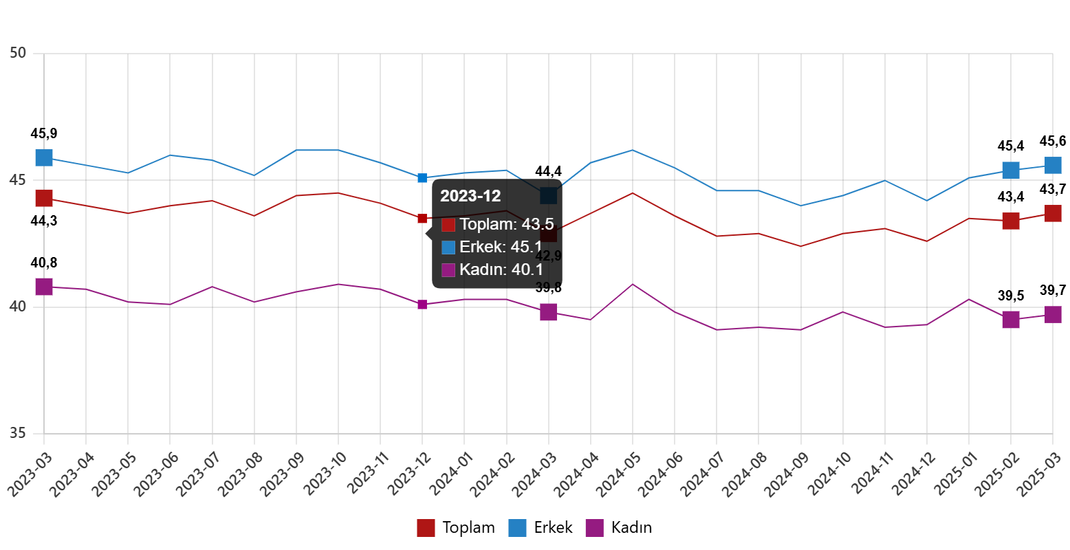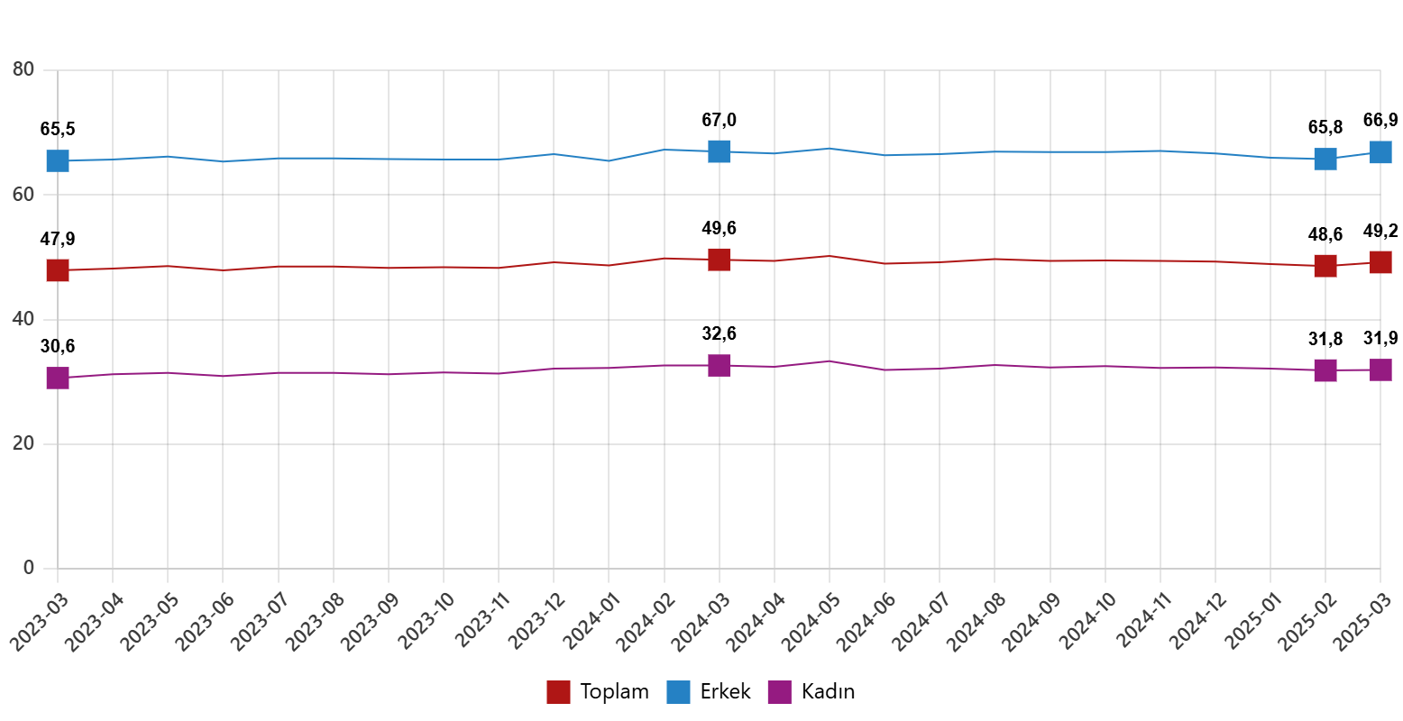 İşgücü 2025 yılı Mart ayında bir evvelki aya nazaran 325 bin kişi artarak 35 milyon 404 bin kişi, işgücüne katılma oranı ise 0,4 puan artarak %53,4 olarak gerçekleşti. İşgücüne katılma oranı erkeklerde %71,6 iken bayanlarda %35,7 oldu.