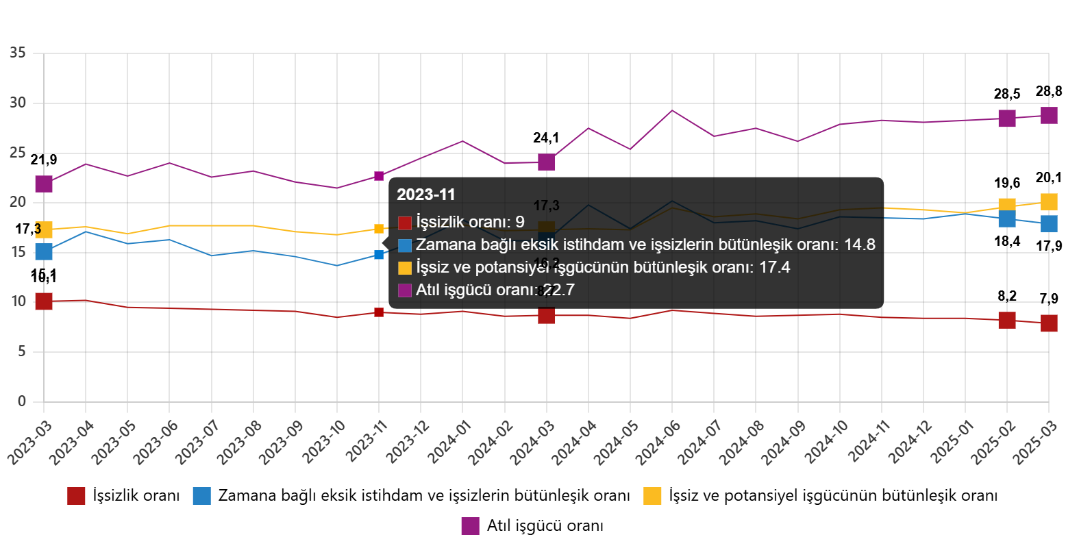 Zamana bağlı eksik istihdam, potansiyel işgücü ve işsizlerden oluşan atıl işgücü oranı 2025 yılı Mart ayında bir evvelki aya nazaran 0,3 puan artarak %28,8 oldu. Vakte bağlı eksik istihdam ve işsizlerin bütünleşik oranı %17,9 iken işsiz ve potansiyel işgücünün bütünleşik oranı %20,1 olarak kestirim edildi.