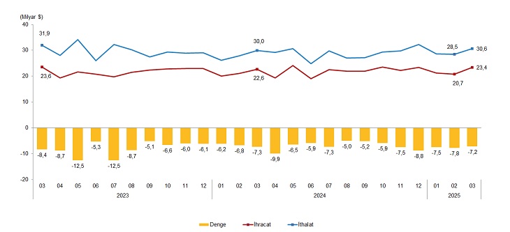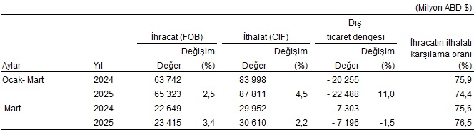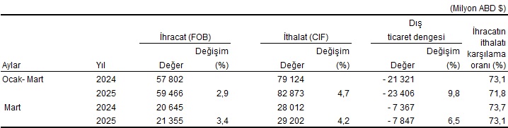 Ocak-Mart periyodunda dış ticaret açığı %9,8 artarak 21 milyar 321 milyon dolardan, 23 milyar 406  milyon dolara yükseldi. İhracatın ithalatı karşılama oranı 2024 Ocak-Mart devrinde %73,1 iken, 2025 yılının birebir periyodunda %71,8’e geriledi.