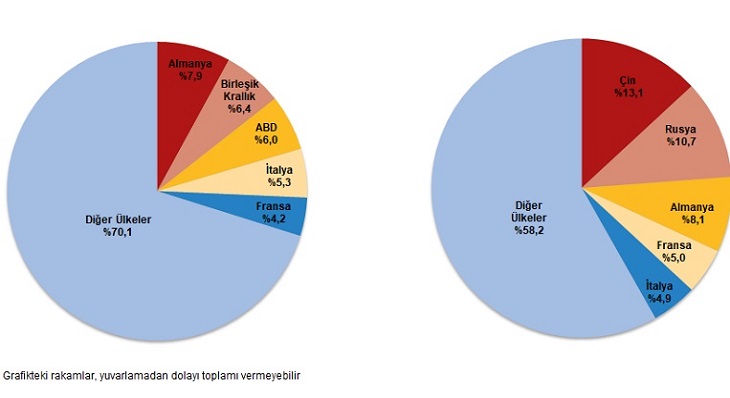 Ocak-Mart devrinde ithalatta birinci sırayı Çin aldı. Çin’den yapılan ithalat 11 milyar 634 milyon dolar olurken, bu ülkeyi sırasıyla; 11 milyar 541 milyon dolar ile Rusya Federasyonu, 6 milyar 485 milyon dolar ile Almanya, 3 milyar 970 milyon dolar ile ABD, 3 milyar 679 milyon dolar ile İtalya izledi. Birinci 5 ülkeden yapılan ithalat, toplam ithalatın %42,5’ini oluşturdu.