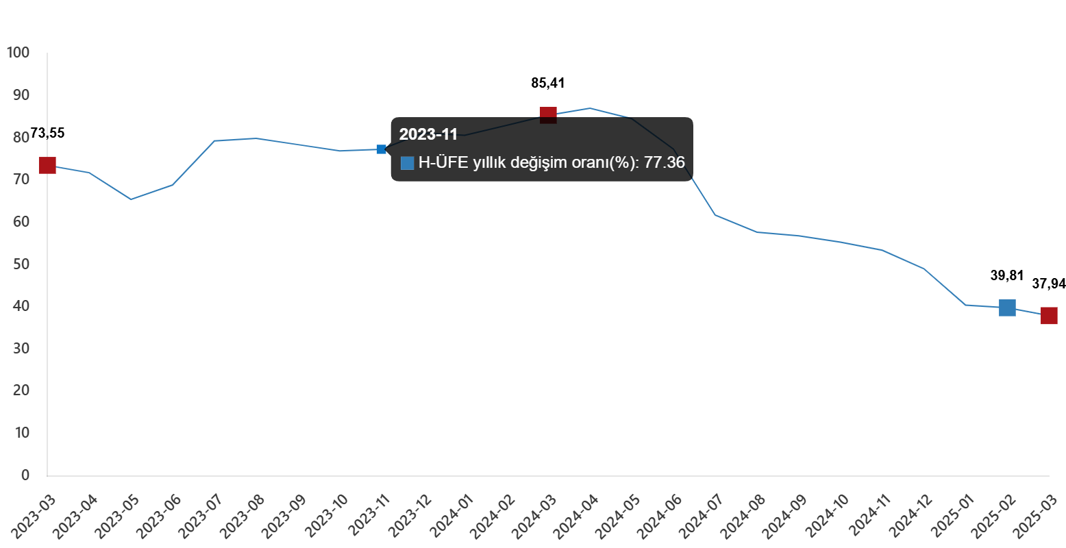 H-ÜFE yıllık değişim oranı(%), Mart 2025