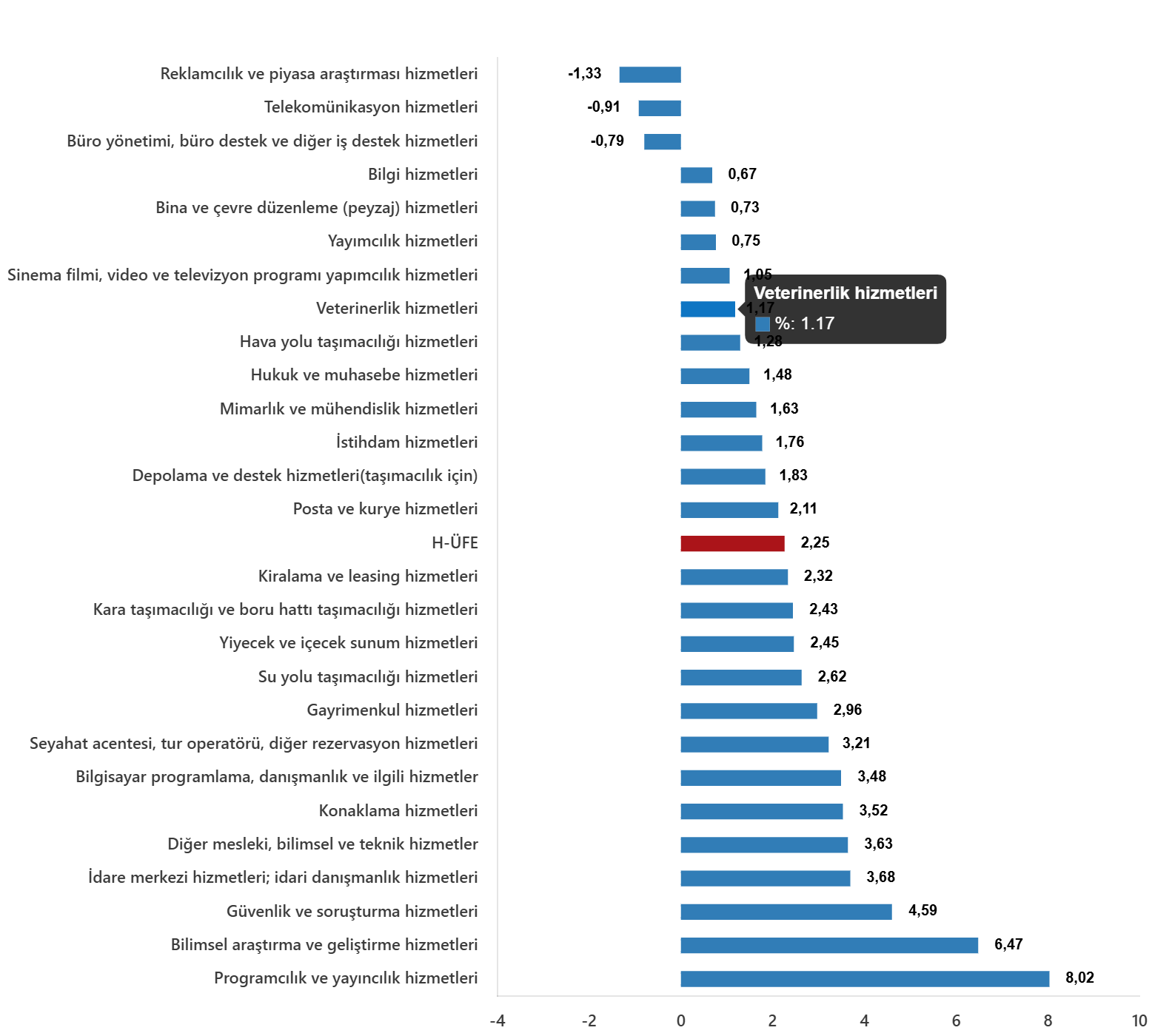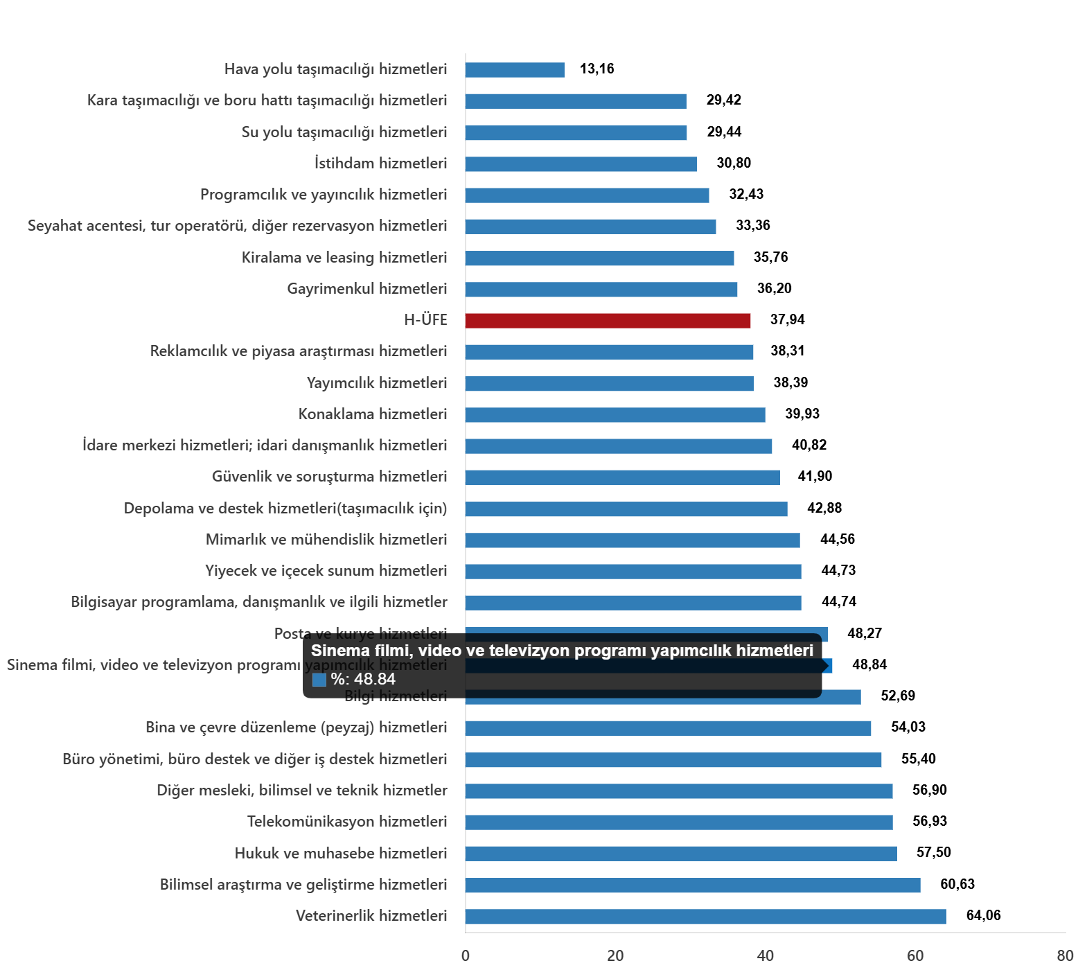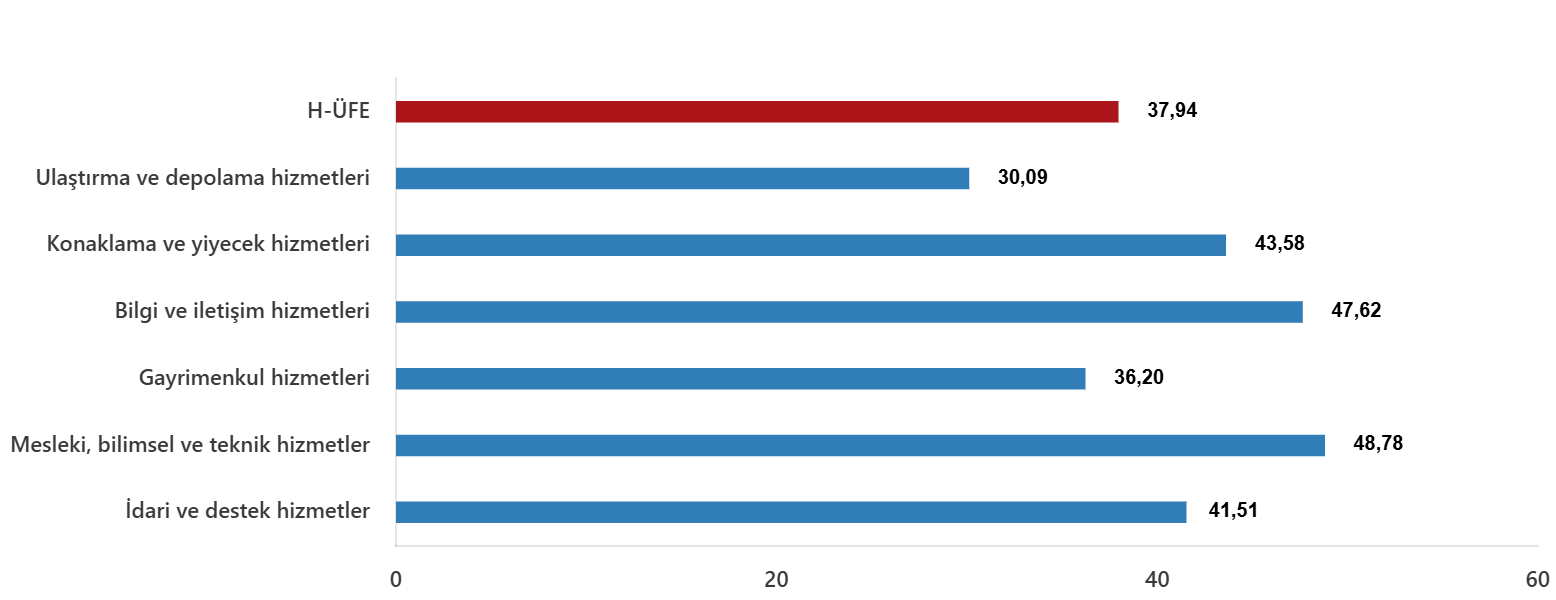 Bir evvelki yılın birebir ayına nazaran, ulaştırma ve depolama hizmetlerinde %30,09 artış, konaklama ve yiyecek hizmetlerinde %43,58 artış, bilgi ve irtibat hizmetlerinde %47,62 artış, gayrimenkul hizmetlerinde %36,20 artış, mesleksel, bilimsel ve teknik hizmetlerde %48,78 artış, idari ve takviye hizmetlerde %41,51 artış gerçekleşti.