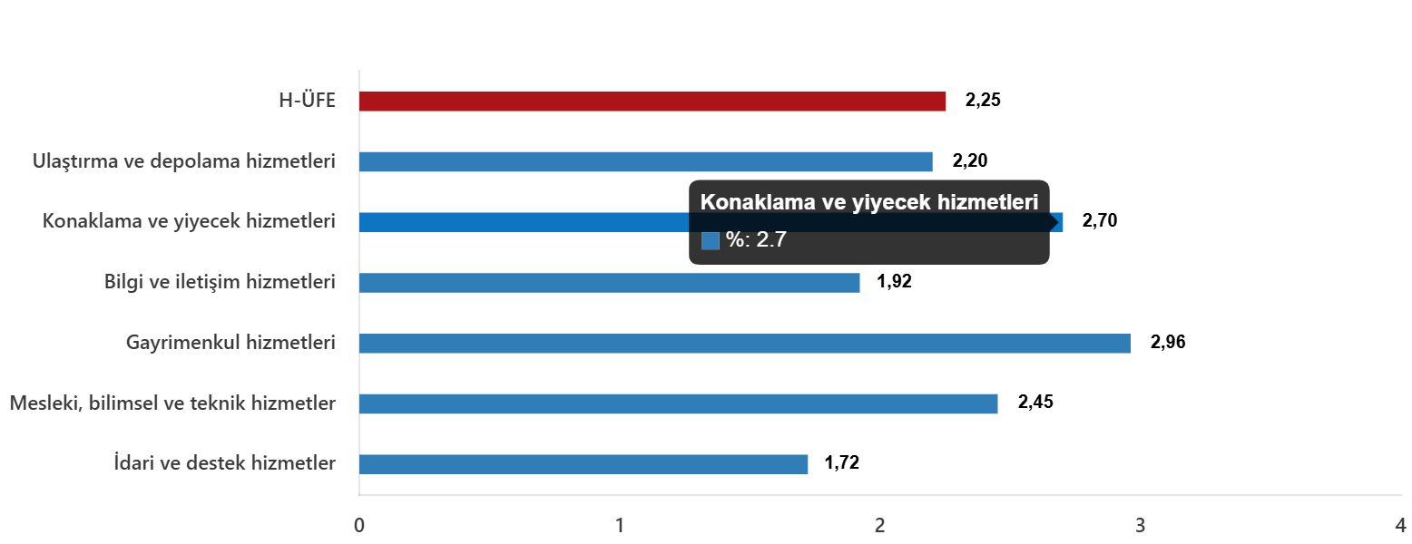 Bir evvelki aya nazaran, ulaştırma ve depolama hizmetlerinde %2,20 artış, konaklama ve yiyecek hizmetlerinde %2,70 artış, bilgi ve irtibat hizmetlerinde %1,92 artış, gayrimenkul hizmetlerinde %2,96 artış, mesleksel, bilimsel ve teknik hizmetlerde %2,45 artış, idari ve takviye hizmetlerde %1,72 artış gerçekleşti.