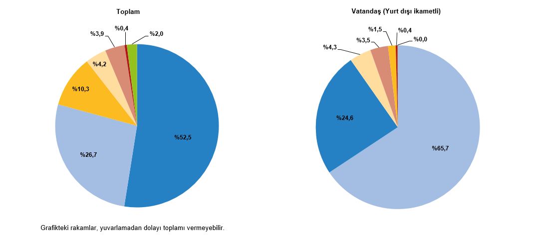İkinci sırada %26,7 ile “akraba ve arkadaş ziyareti”, üçüncü sırada ise %10,3 ile “alışveriş” yer aldı. Yurt dışı ikametli vatandaşlar ise ülkemize %65,7 ile en çok “akraba ve arkadaş ziyareti” maksadıyla geldi.