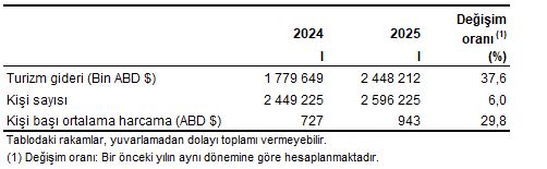 Turizm masrafı, geçen yılın birebir çeyreğine nazaran %37,6 artarak 2 milyar 448 milyon 212 bin dolar oldu. Bunun 1 milyar 907 milyon 35 bin dolarını şahsî, 541 milyon 177 bin dolarını ise paket tıp harcamaları oluşturdu.