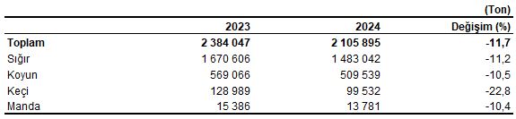 Buna nazaran 2023 yılında 2 milyon 384 bin 47 ton olan kırmızı et üretimi, 2024 yılında %11,7 azalarak 2 milyon 105 bin 895 ton olarak varsayım edildi. Bu kapsamda bir evvelki yıla nazaran sığır eti üretimi %11,2 azalarak 1 milyon 483 bin 42 ton, koyun eti üretimi %10,5 azalarak 509 bin 539 ton, keçi eti üretimi %22,8 azalarak 99 bin 532 ton, manda eti üretimi ise %10,4 azalarak 13 bin 781 ton oldu.