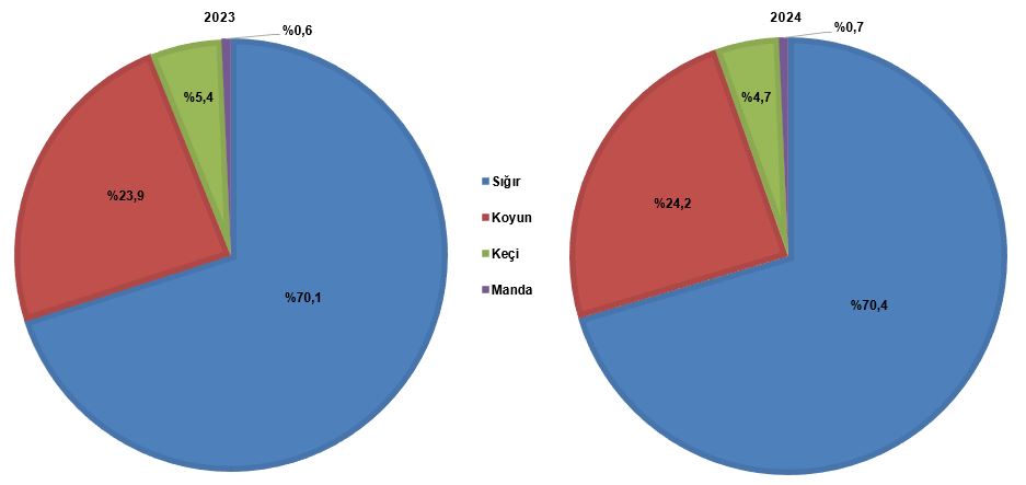 Kırmızı et üretiminin, 2023 yılında %70,1’ini sığır eti, %23,9’unu koyun eti, %5,4’ünü keçi eti ve %0,6’sını manda eti oluştururken, 2024 yılında %70,4’ünü sığır eti, %24,2’sini koyun eti, %4,7’sini keçi eti ve %0,7’sini manda eti oluşturmuştur.