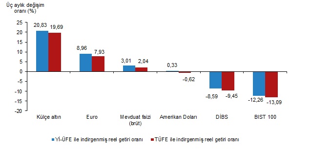 Külçe altın, üç aylık değerlendirmede; Yİ-ÜFE ile indirgendiğinde %20,83, TÜFE ile indirgendiğinde ise %19,69 oranlarında yatırımcısına en yüksek gerçek getiri sağlayan yatırım aracı oldu. Tıpkı periyotta BIST 100 endeksi, Yİ-ÜFE ile indirgendiğinde %12,26, TÜFE ile indirgendiğinde ise %13,09 oranlarında yatırımcısına en çok kaybettiren yatırım aracı oldu.