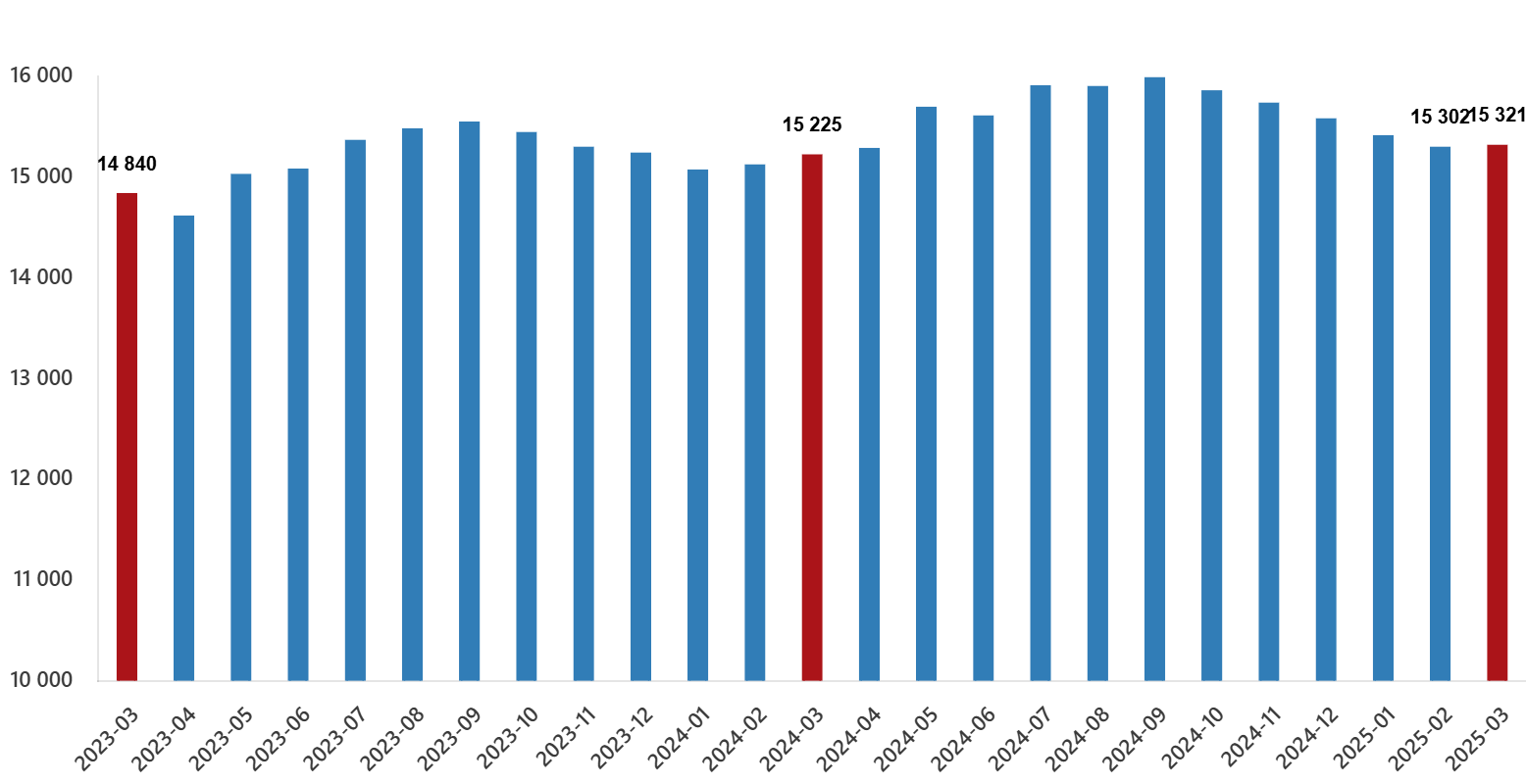 Sanayi, inşaat ve ticaret-hizmet dalları toplamında fiyatlı çalışan sayısı 2025 Mart ayında bir evvelki yılın birebir ayına nazaran %0,6 arttı. Fiyatlı çalışan sayısı bir evvelki yılın birebir ayında 15 milyon 224 bin 973 kişi iken, 2025 yılı Mart ayında 15 milyon 320 bin 987 kişi oldu.