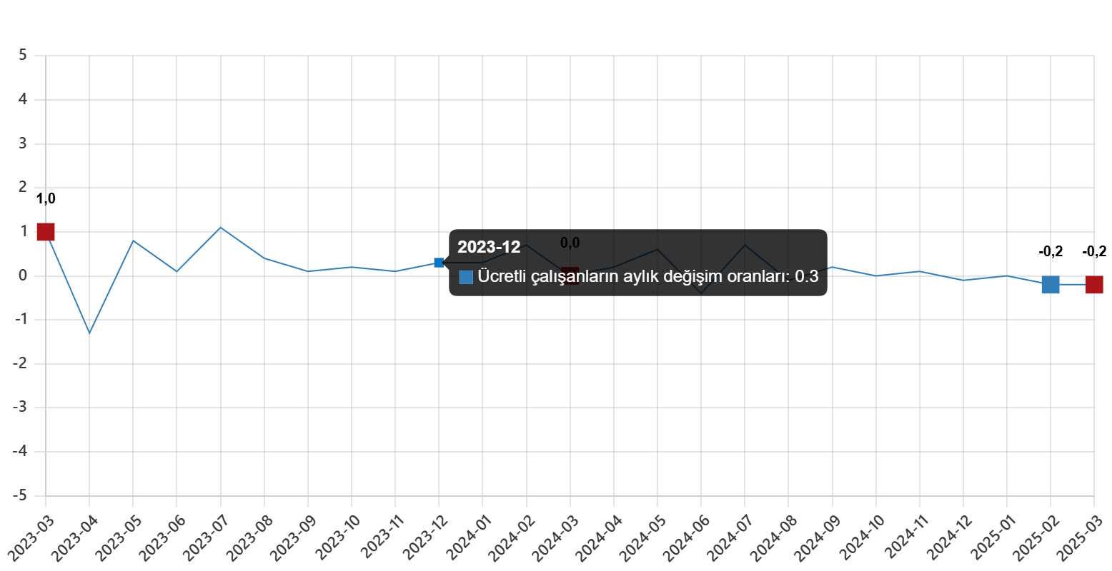 Ücretli çalışanların aylık değişim oranları (%), Mart 2025