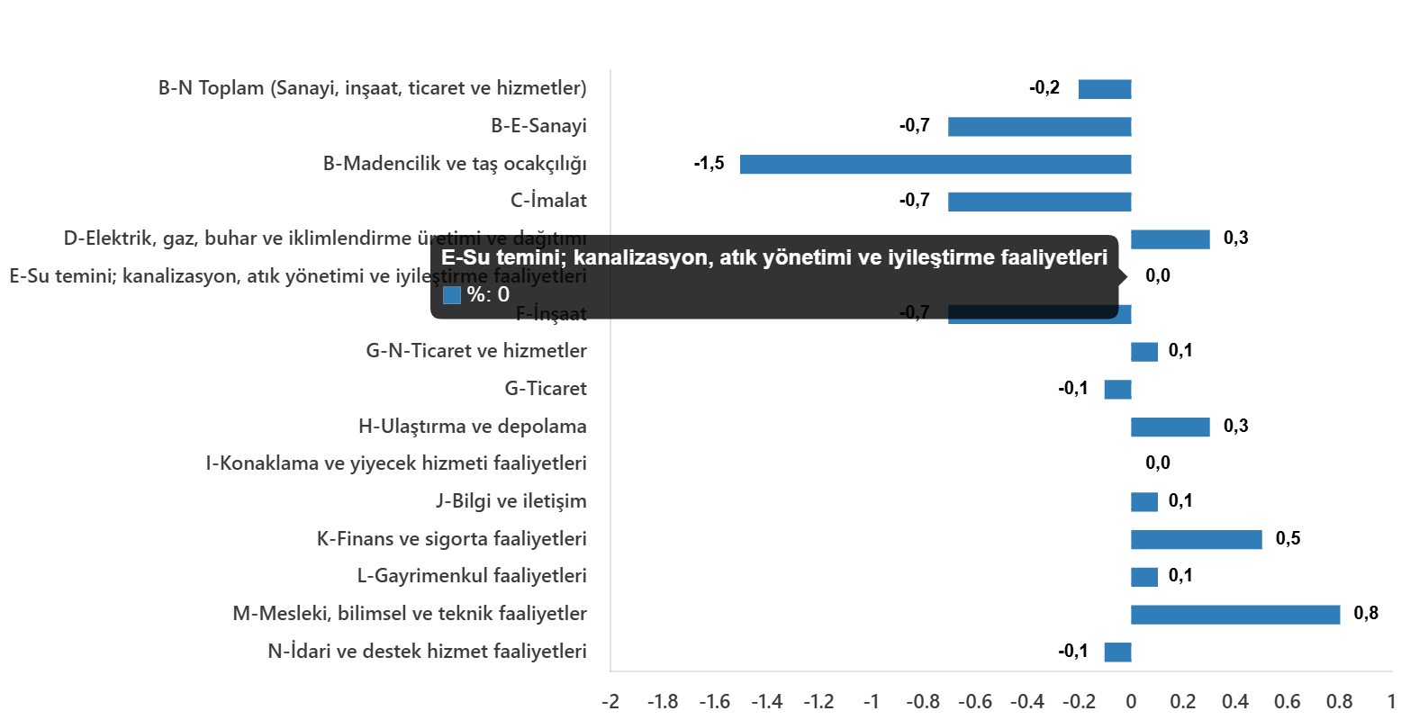 | E-Su temini; kanalizasyon, atık idaresi ve güzelleştirme faaliyetleri | 64 499 | 67 546 | -3 047 | -4,5 |