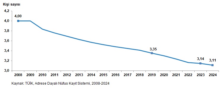 Adrese Dayalı Nüfus Kayıt Sistemi (ADNKS) sonuçlarına nazaran, Türkiye’de 2008 yılında 4 kişi olan ortalama hanehalkı büyüklüğünün, azalma eğilimi göstererek 2024 yılında 3,11 bireye düştüğü görüldü.