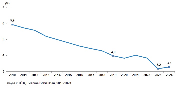 Evlenme istatistikleri sonuçlarına nazaran, 2010 yılında gerçekleşen resmi evlenmelerin %5,9’unun akraba evliliği olduğu ve bu oranın sonraki yıllarda daima düşüş göstererek 2019 yılında %4, 2024 yılında ise %3,3 olduğu görüldü.