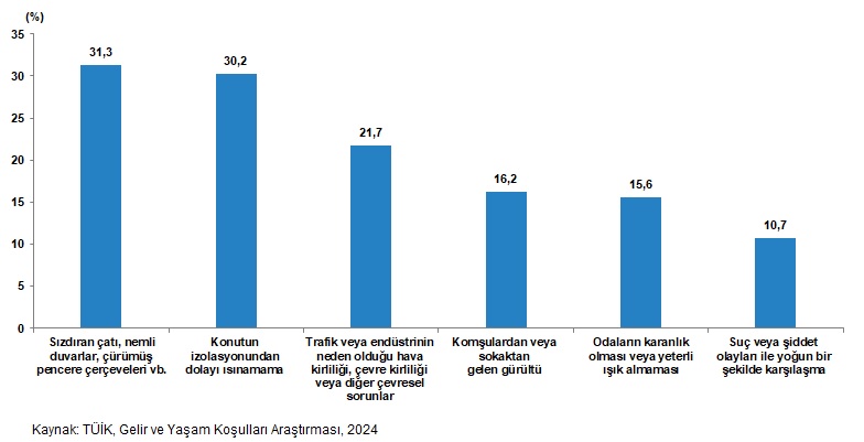 Gelir ve ömür şartları araştırması sonuçlarına nazaran; 2024 yılında nüfusun %31,3’ü konutunda sızdıran çatı, nemli duvarlar, çürümüş pencere çerçevesi vb. problemle karşılaştı.