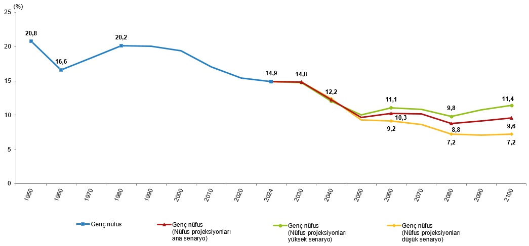 Nüfus projeksiyonlarının demografik göstergelerdeki mevcut yapının devam edeceğini varsayan ana senaryosuna nazaran genç nüfus oranının 2030 yılında %14,8, 2040 yılında %12,2, 2060 yılında %10,3, 2080 yılında %8,8 ve 2100 yılında %9,6 olacağı öngörüldü.