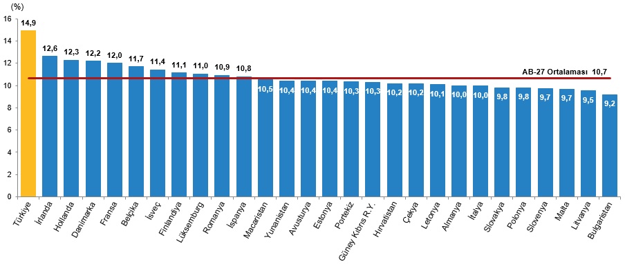 AB üyesi 27 ülkenin genç nüfus oranları incelendiğinde, 2024 yılında genç nüfus ortalaması %10,7 oldu. AB üye ülkeleri arasında en yüksek genç nüfus oranına sahip olan ülkelerin sırasıyla %12,6 ile İrlanda, %12,3 ile Hollanda ve %12,2 ile Danimarka olduğu görüldü. Genç nüfus oranının en düşük olduğu ülkeler ise sırasıyla %9,2 ile Bulgaristan, %9,5 ile Litvanya, %9,7 ile Malta ve Slovenya olduğu görüldü. Türkiye’nin genç nüfus oranının %14,9 ile AB üye ülkelerinin genç nüfus oranlarından daha yüksek olduğu görüldü.