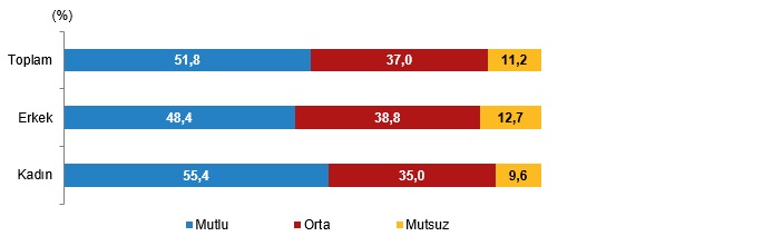 Kendini keyifli olarak hisseden 18-24 yaş kümesindeki erkek nüfusun oranı %48,4 iken kendini mutsuz hissettiğini belirtenlerin oranı ise %12,7 oldu. Kendini keyifli hissettiğini belirten 18-24 yaş kümesindeki genç bayan nüfusun oranı %55,4 iken kendini mutsuz hissettiğini belirtenlerin oranı ise %9,6 oldu.