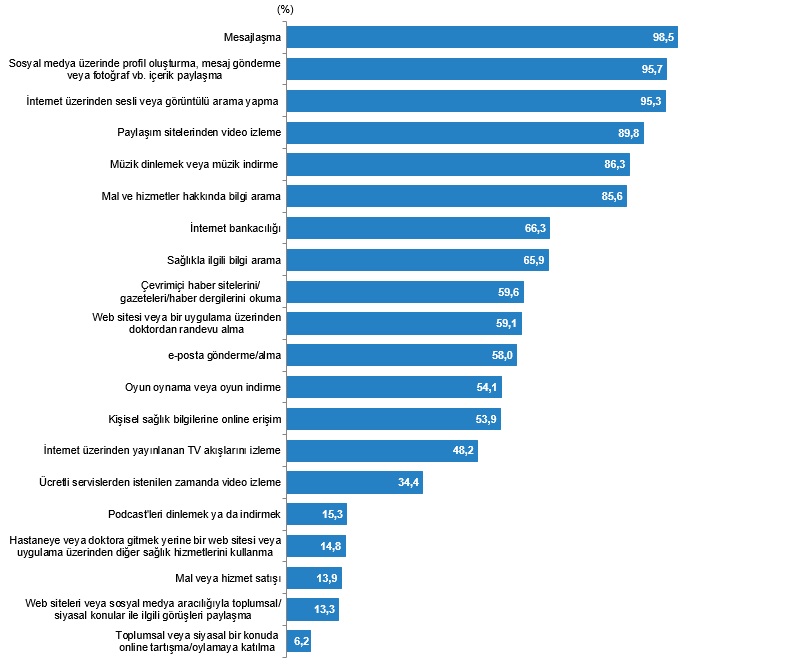 Hanehalkı Bilişim Teknolojileri (BT) Kullanım Araştırması sonuçlarına nazaran 16-24 yaş kümesindeki gençlerin İnternet aracılığı ile yürüttüğü faaliyetlerde, iletileşme %98,5 birinci sırayı alırken, %95,7 ile toplumsal medya üzerinden profil oluşturma ve içerik paylaşma ikinci sırada yer aldı. Bunu %95,3 ile İnternet üzerinden sesli ve manzaralı arama yapma, %89,8 ile paylaşım sitelerinden görüntü izleme takip etti. Gençlerin İnternette en az yürüttüğü faaliyet ise %6,2 ile toplumsal yahut siyasal mevzuda online tartışma/oylamaya katılma oldu.