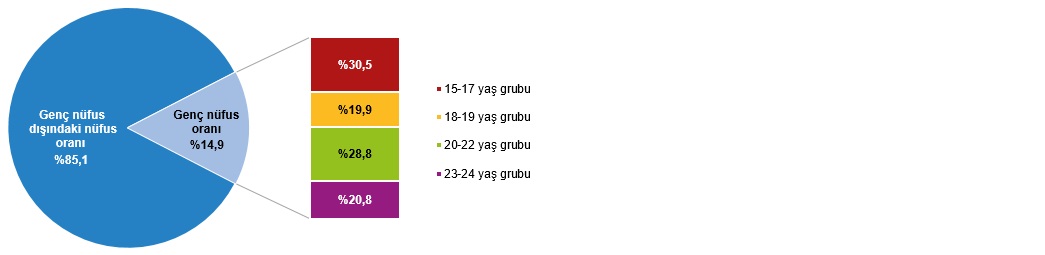 Genç nüfus yaş kümesine nazaran incelendiğinde, 2024 yılında genç nüfusun %30,5’inin 15-17 yaş kümesinde, %19,9’unun 18-19 yaş kümesinde, %28,8’inin 20-22 yaş kümesinde ve %20,8’inin ise 23-24 yaş kümesinde yer aldığı görüldü.