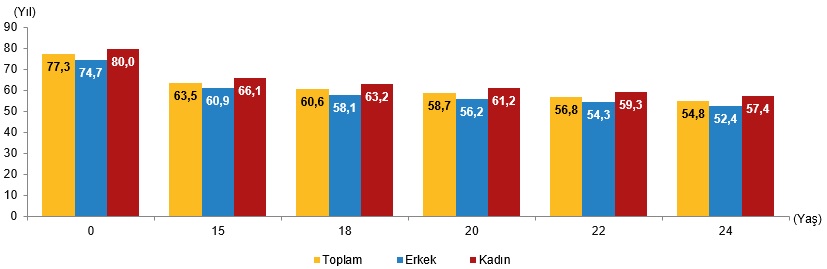 Türkiye’de çalışma çağının başlangıcı olan 15 yaşındaki gençler için beklenen ömür mühletinin 63,5 yıl, erkekler için 60,9 yıl ve bayanlar için 66,1 yıl olduğu görüldü. Başka bir söz ile 15 yaşına ulaşan genç bayanların genç erkeklerden ortalama 5,2 yıl daha fazla yaşayacağı iddia edildi.
