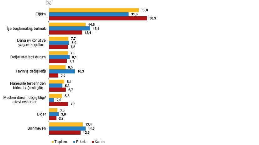 İç Göç İstatistiklerine nazaran Türkiye’de 2023 yılında en fazla göç hareketliliğinin yaşandığı 20-24 yaş kümesinin göç etme nedenleri incelendiğinde; bu hareketliliğin en büyük nedeninin eğitim olduğu görüldü. Gençlerin 231 bin 477’sinin eğitim, 94 bin 139’unun işe başlamak yahut iş bulmak ve 50 bin 8’inin ise daha güzel konut ve hayat şartları nedeniyle göç ettiği görüldü.