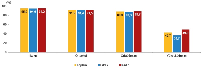 Türkiye’de 2022/’23 öğretim yılında %46,0 olan yükseköğretim net okullaşma oranı, 2023/’24 öğretim yılında %42,7 oldu. Yükseköğretim net okullaşma oranı cinsiyete nazaran incelendiğinde, erkeklerde bu oran %41,1 iken %36,7, bayanlarda ise %51,2 iken %49,0 oldu.