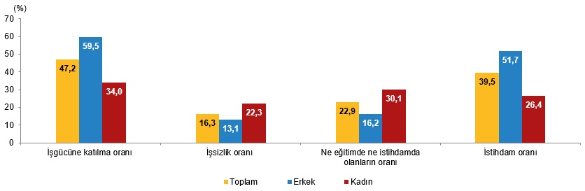 Ne eğitimde ne istihdamda olan gençlerin oranı 2023 yılında %22,5 iken 2024 yılında %22,9 oldu. Genç erkeklerde ne eğitimde ne istihdamda olanların oranı 2023 yılında %15,6 iken 2024 yılında %16,2, genç bayanlarda ise bu oran 2023 yılında %29,8 iken 2024 yılında %30,1 oldu.