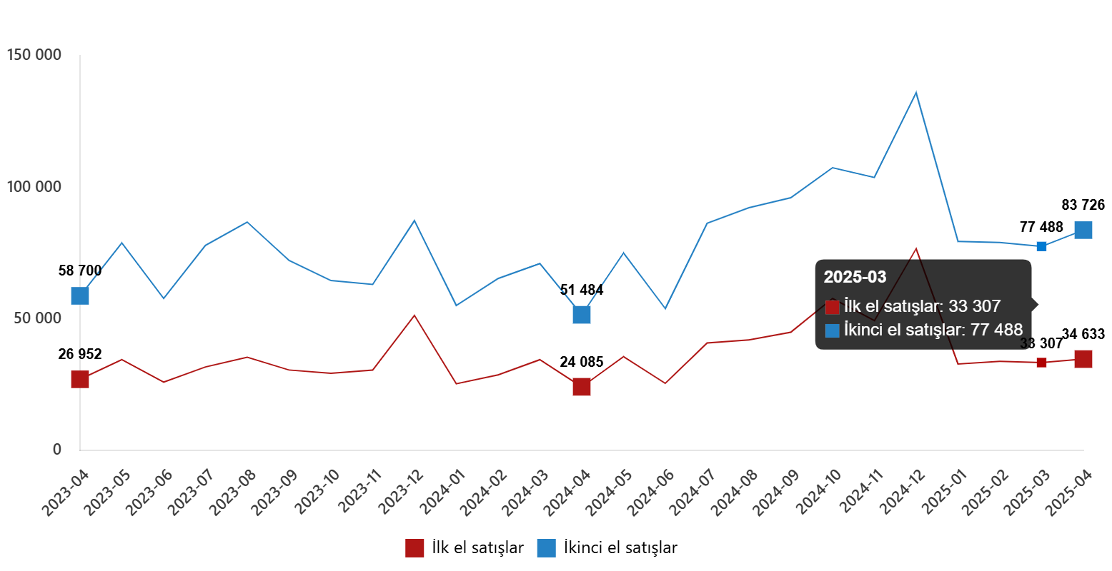 | İlk el satış | 34 633 | 24 085 | 43,8 | 134 509 | 112 341 | 19,7 |