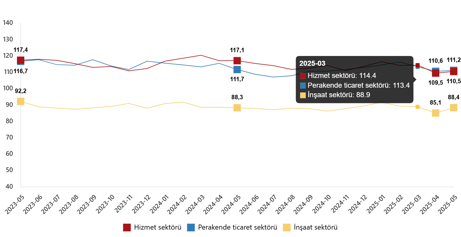 Mevsim tesirlerinden arındırılmış inanç endeksi Mayıs ayında bir evvelki aya nazaran; hizmet bölümünde %0,9 oranında artarak 110,5 bedelini, perakende ticaret kesiminde %0,6 oranında artarak 111,2 kıymetini ve inşaat bölümünde %3,9 oranında artarak 88,4 bedelini aldı.