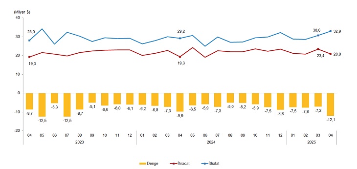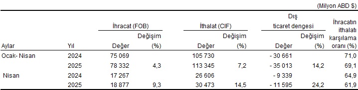 Nisan ayında dış ticaret açığı %24,2 artarak 9 milyar 339 milyon dolardan, 11 milyar 595 milyon dolara yükseldi. İhracatın ithalatı karşılama oranı 2024 Nisan ayında %64,9 iken, 2025 Nisan ayında %61,9’a geriledi.