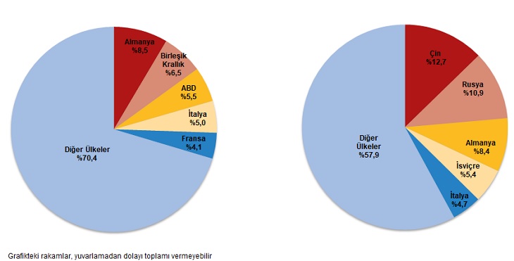 İthalatta Çin birinci sırayı aldı. Nisan ayında Çin’den yapılan ithalat 4 milyar 177 milyon dolar olurken, bu ülkeyi sırasıyla; 3 milyar 582 milyon dolar ile Rusya Federasyonu, 2 milyar 773 milyon dolar ile Almanya, 1 milyar 775 milyon dolar ile İsviçre, 1 milyar 537 milyon dolar ile İtalya izledi. Birinci 5 ülkeden yapılan ithalat, toplam ithalatın %42,1’ini oluşturdu.