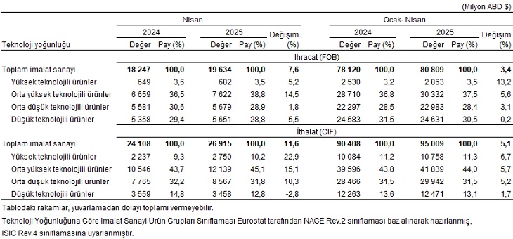 Teknoloji yoğunluğuna nazaran imalat sanayi eserleri dış ticareti, Nisan 2025