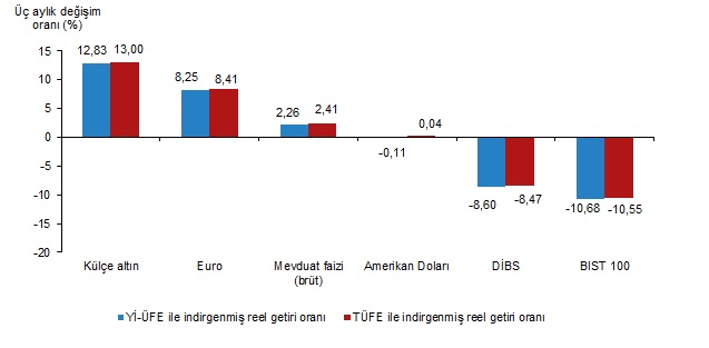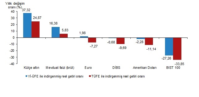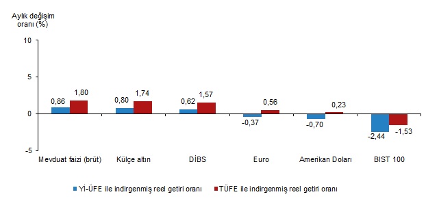 Yİ-ÜFE ile indirgendiğinde; yatırım araçlarından külçe altın %0,80 ve Devlet İç Borçlanma Senetleri (DİBS) %0,62 oranlarında yatırımcısına gerçek getiri sağlarken; Euro %0,37, Amerikan Doları %0,70 ve BIST 100 endeksi %2,44 oranlarında yatırımcısına kaybettirdi. TÜFE ile indirgendiğinde ise; külçe altın %1,74, DİBS %1,57, Euro %0,56 ve Amerikan Doları %0,23 oranlarında yatırımcısına gerçek getiri sağlarken; BIST 100 endeksi %1,53 oranında yatırımcısına kaybettirdi.