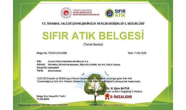 Türkiye Cumhuriyeti Etraf, Şehircilik ve İklim Değişikliği Bakanlığı tarafından yürürlüğe konulan Sıfır Atık Yönetmeliği kapsamında elde edilen bu evrak, Atlas Copco Türkiye’nin etraf idaresi konusundaki kararlılığını ve liderliğini bir sefer daha kanıtladı. Şirket, atık idaresinden güç verimliliğine kadar birçok alanda çevresel tesirlerini minimize etmek için somut adımlar atıyor.